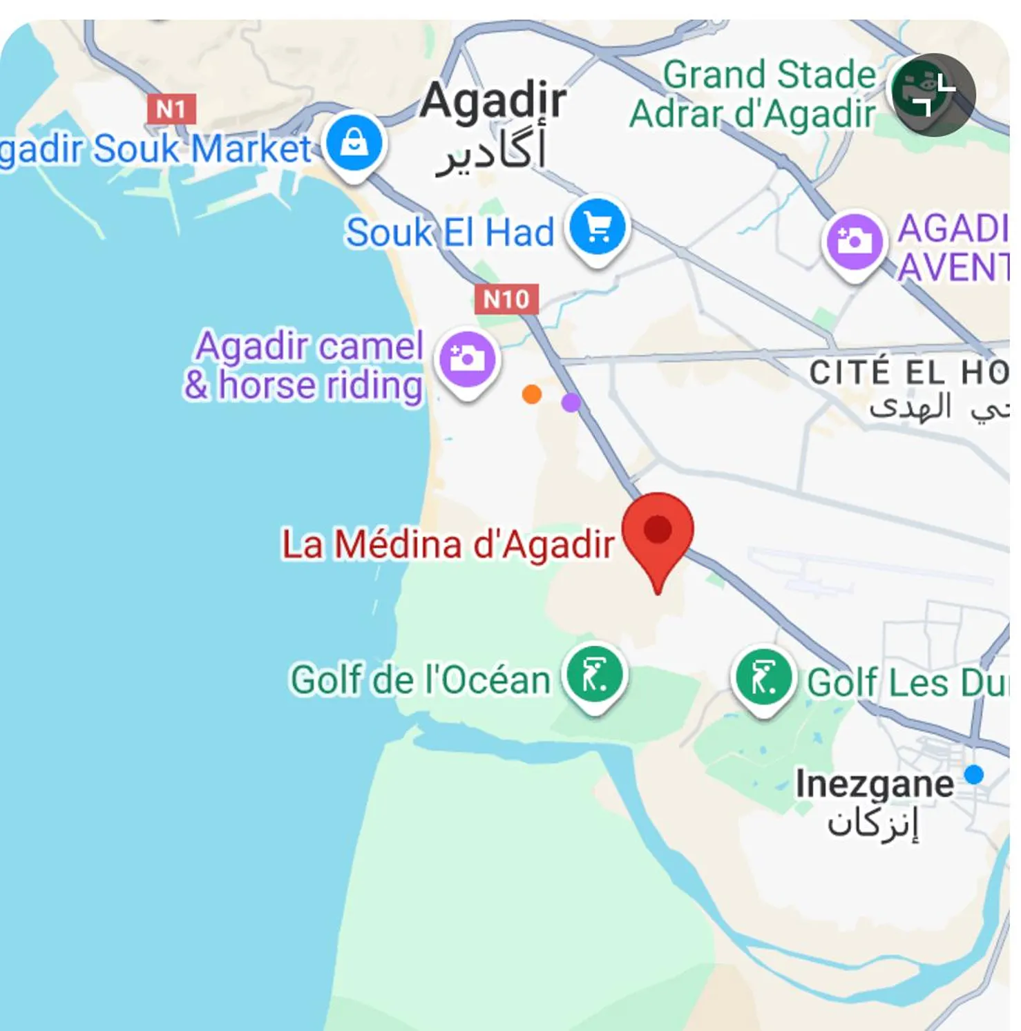 Distance : env. 3,5 km du centre d’Agadir (quartier Bensergao). Accès : taxi (dire “Médina Coco Polizzi”), ou voiture avec stationnement possible aux abords.