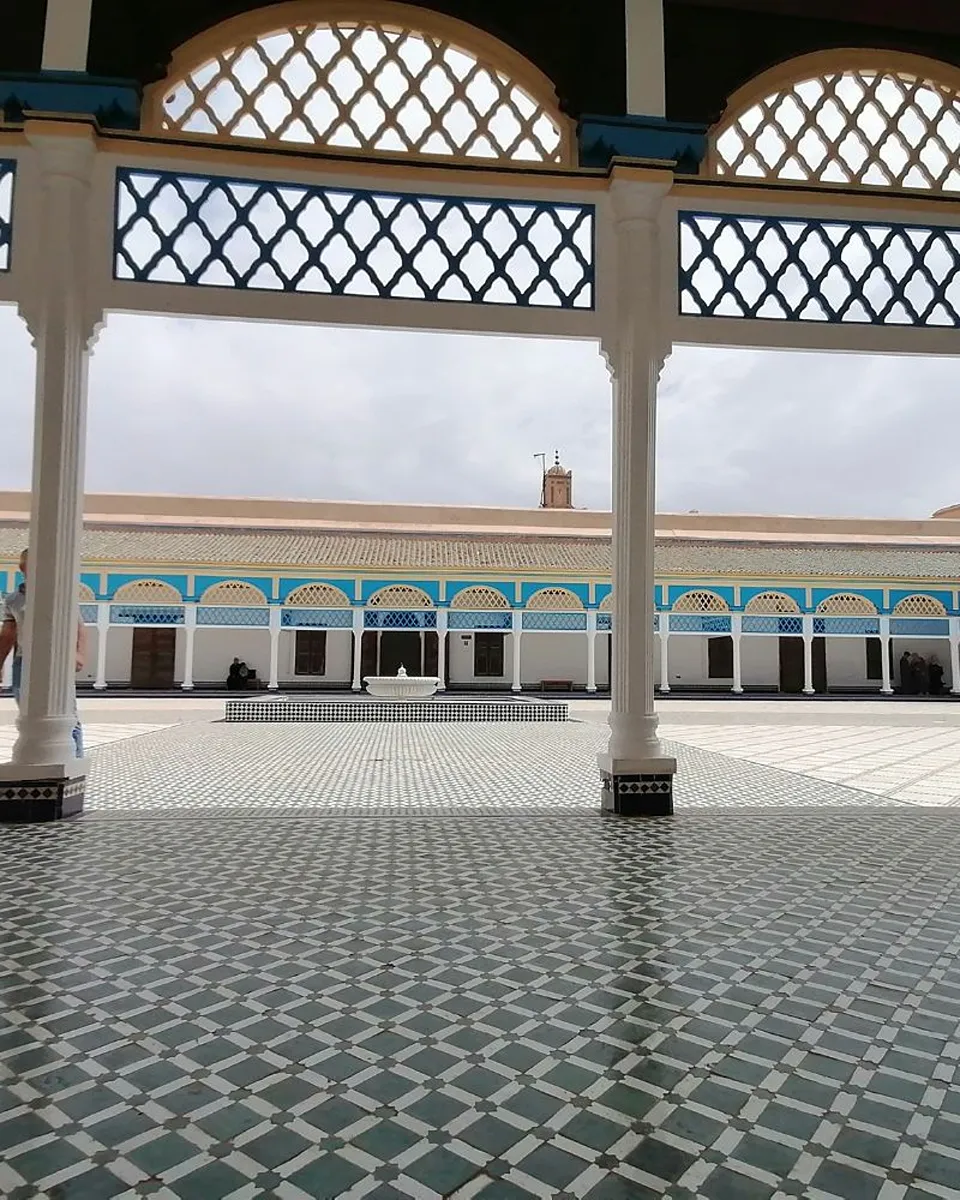 La partie la plus impressionnante du Palais Bahia est sans doute la Grande Cour, vaste esplanade entourée de galeries richement décorées. Le sol en marbre et les zelliges géométriques forment un décor spectaculaire, souvent prisé des photographes.