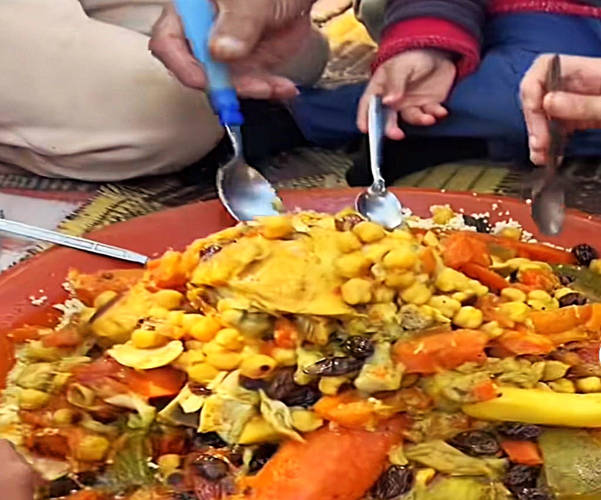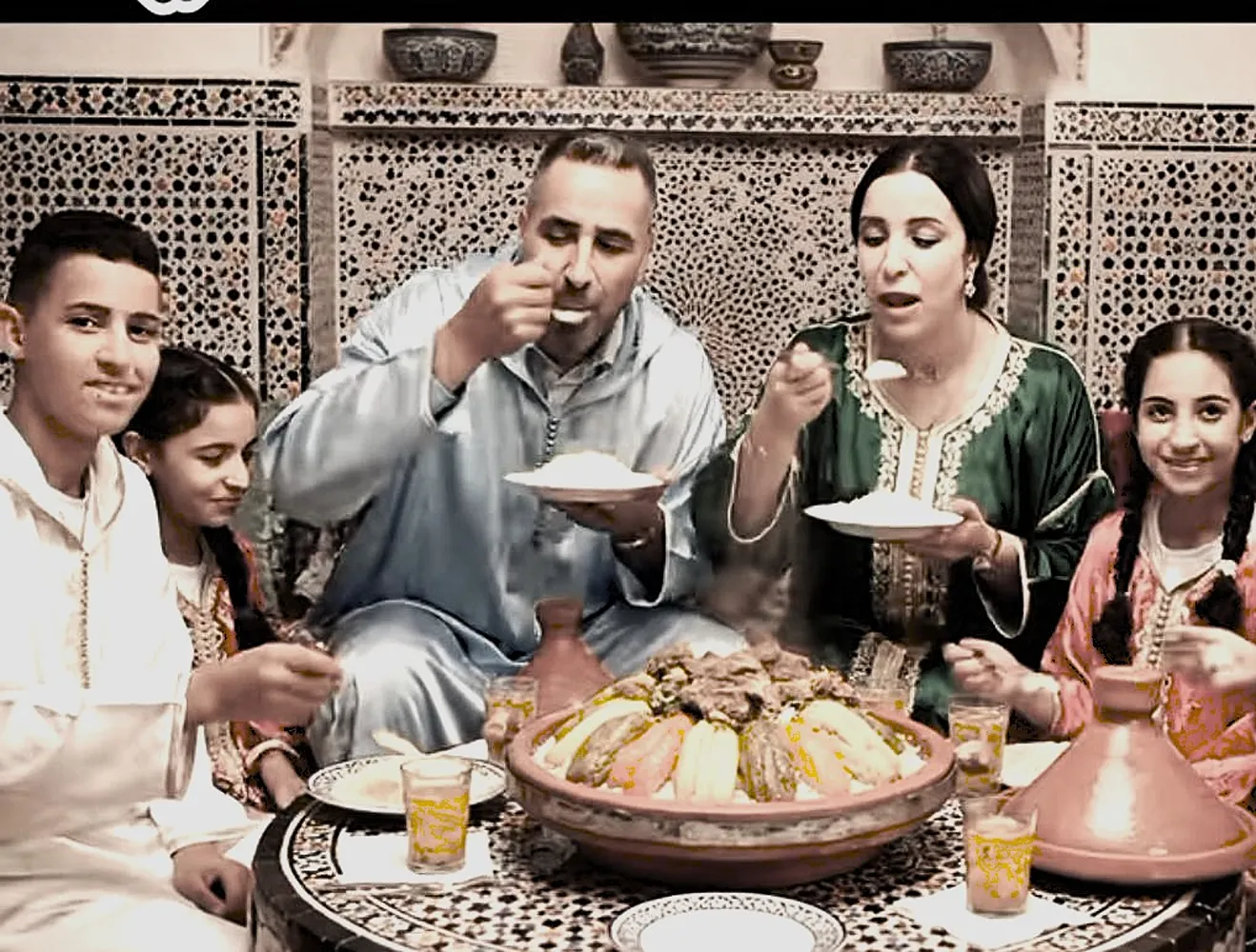 Le moment du repas renforce cette symbolique. Le couscous est servi dans un plat commun autour duquel chacun prend place. Ce partage direct dans la société marocaine, sans séparation individuelle, exprime une idée forte d’égalité et d’appartenance. Il rappelle que manger ensemble est un acte social, et que le couscous est fait pour rassembler. Dans l’imaginaire collectif, le consommer seul perd une grande partie de son sens.